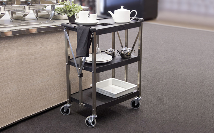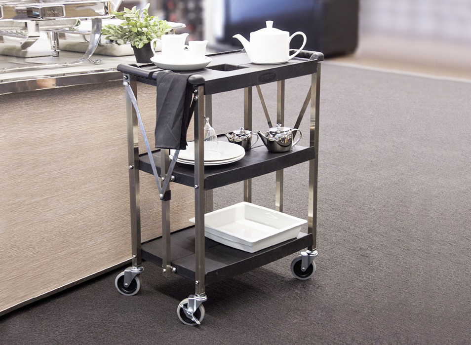 堅(jiān)厚的不銹鋼材料,車(chē)表面帶有磨砂處理,美觀耐用卡扣設(shè)計(jì),可快速、簡(jiǎn)單的折疊或展開(kāi)餐車(chē); 折疊存放可減少50%的面積; 符合人體工學(xué)的把手設(shè)計(jì),操作舒適; 4”萬(wàn)向靜音輪,其中兩個(gè)帶剎;安全,安靜可承重150KG; 廣泛使用于各類(lèi)餐廳和酒店.